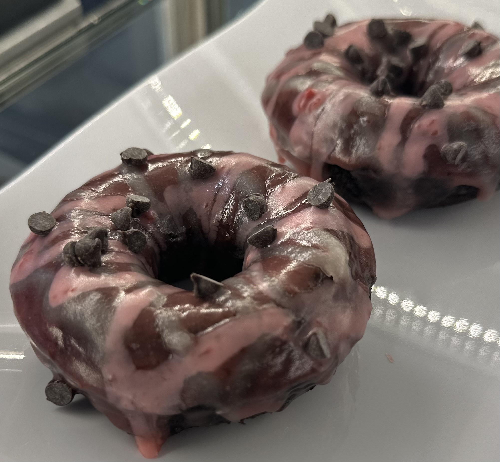 Chocolate Donut, Strawberry Glaze, White Chocolate Drizzle, Strawberry Drizzle & Mini Chocolate Chips